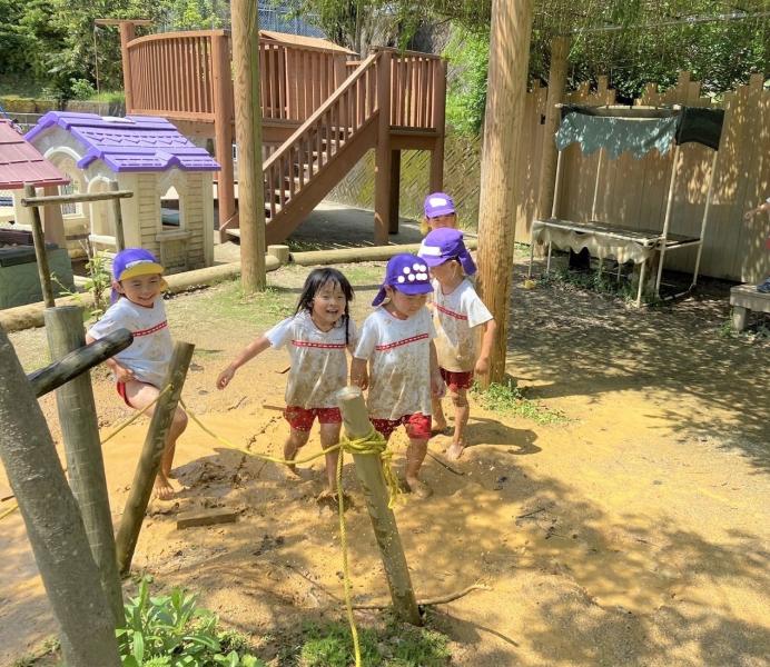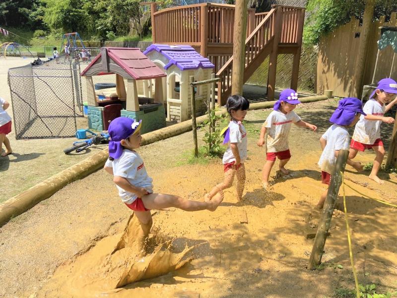 みんなで裸足になって泥んこ遊び♪「温泉みたーーい!!」「気持ちいいね〜。」にぎやかな声が聞こえてきます。家庭ではなかなか経験できない遊びを泥んこになりながら、全身で楽しみました♪