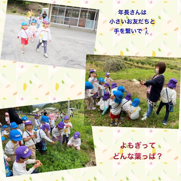 年少・年中・年長でよもぎを摘みに行きました。食育活動として年長児が摘んできたよもぎを洗い、あくを抜き、よもぎ団子にしました。5月の餅つきでよもぎ団子を入れ草餅にし、みんなで食べました。