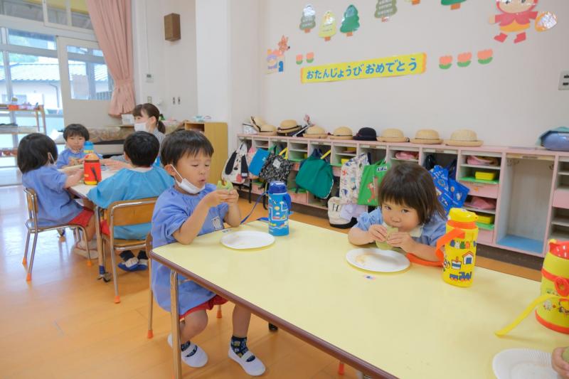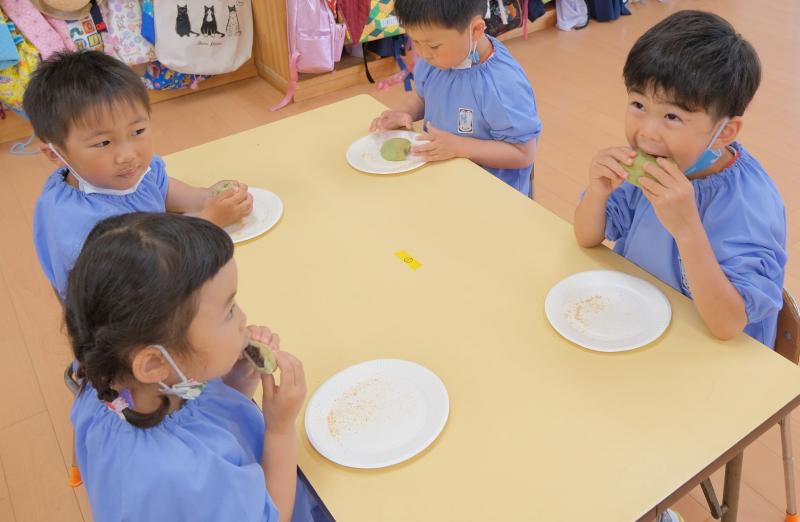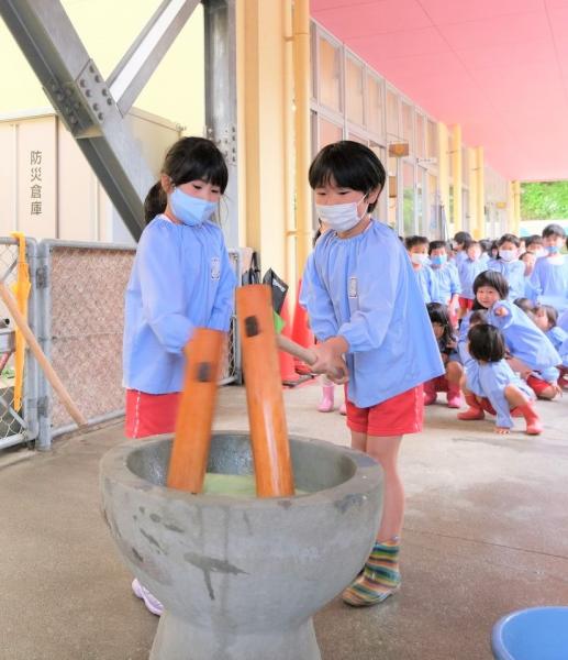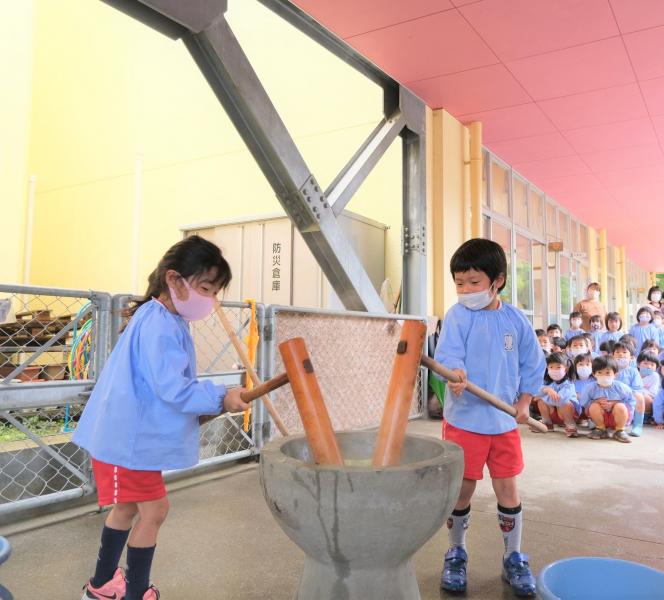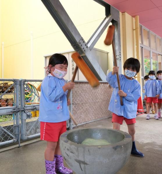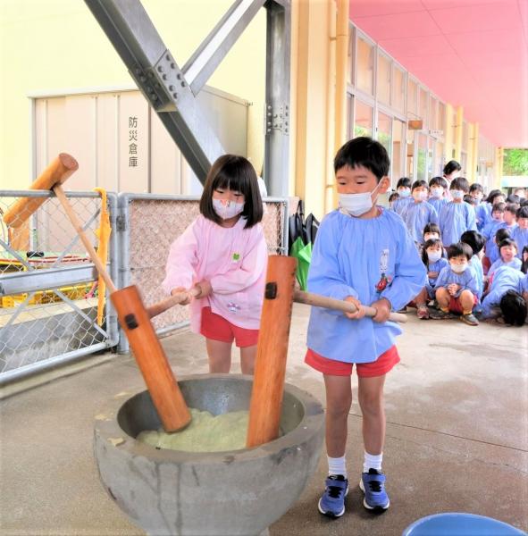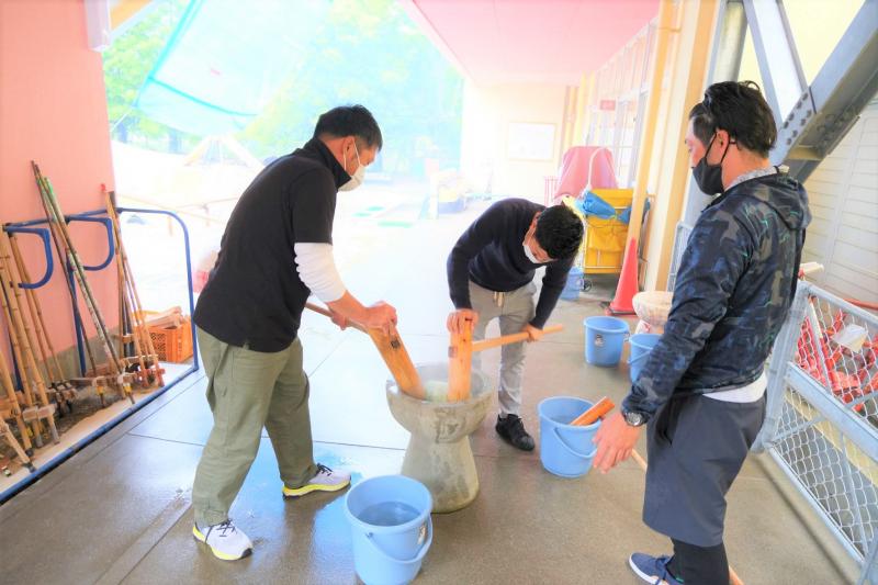 5月12日(木) あいにくの雨の中、PTA役員執行部のお父さんにご協力いただき無事おもちつきを行うことができました。杵と臼を使った昔ながらのもちつきを体験。つきたてのおもちをみんなで美味しくいただきました。美味しかったね♪