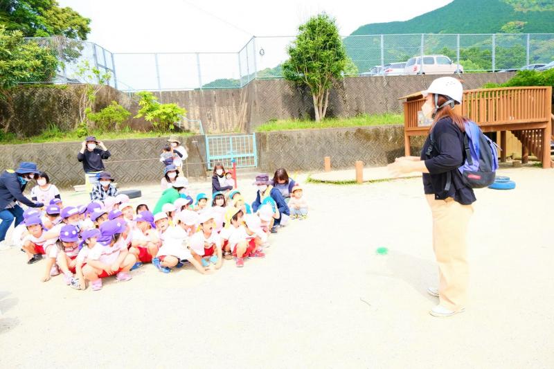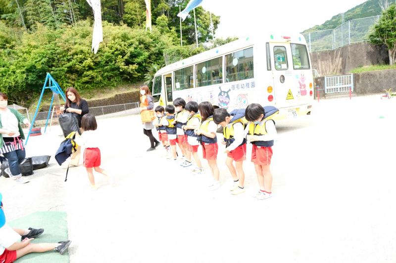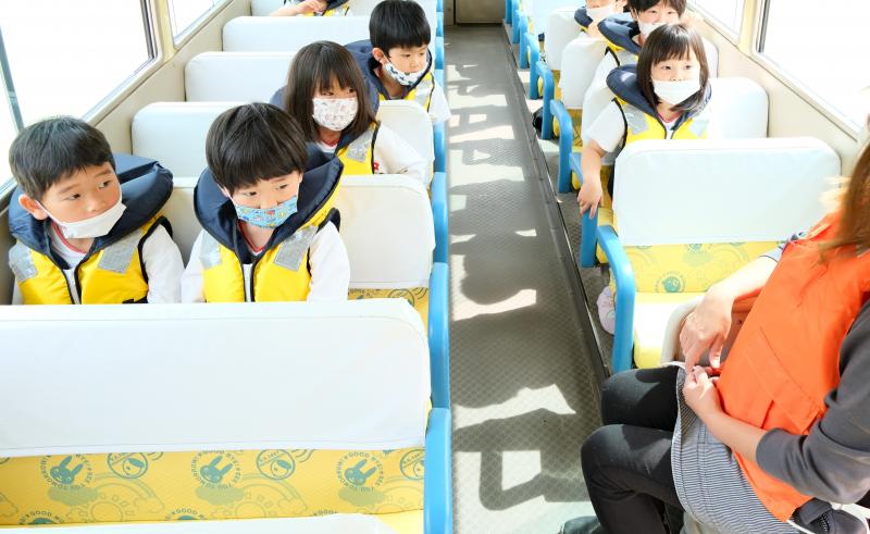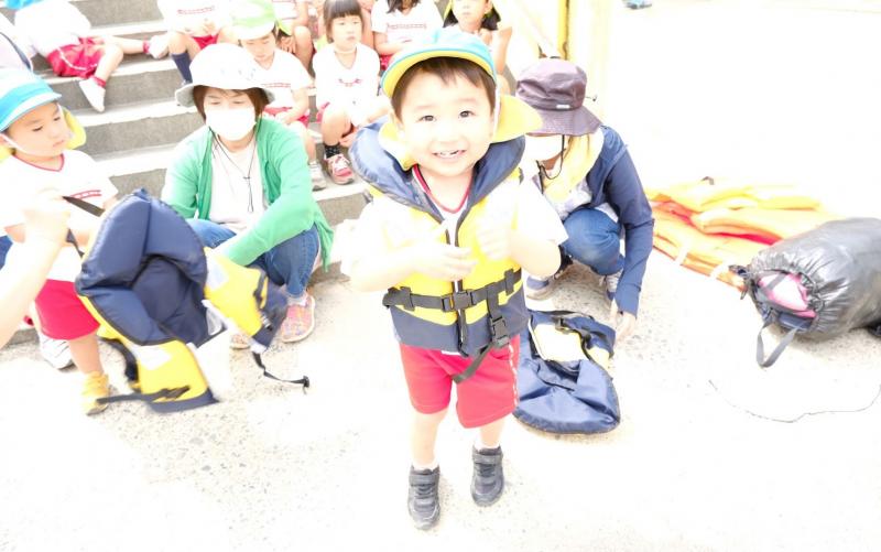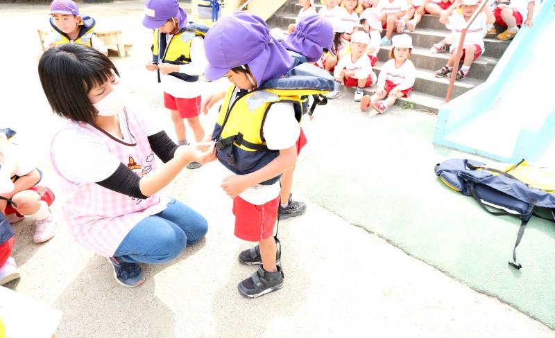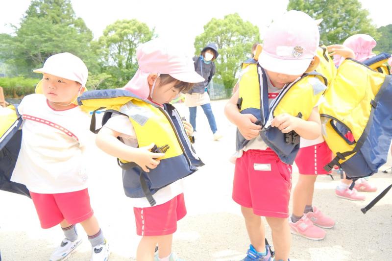 5月19日(木)月に一度行う地震の避難訓練の様子です。今回は園バス走行中に起きた災害を想定し、2歳児から5歳児を対象にライフジャケット着脱の練習も行いました。また、川や海で遊ぶ時もライフジャケット着用の大切さを子どもたちにお話ししました。今後もあらゆる状況を想定し、避難訓練を行います。
