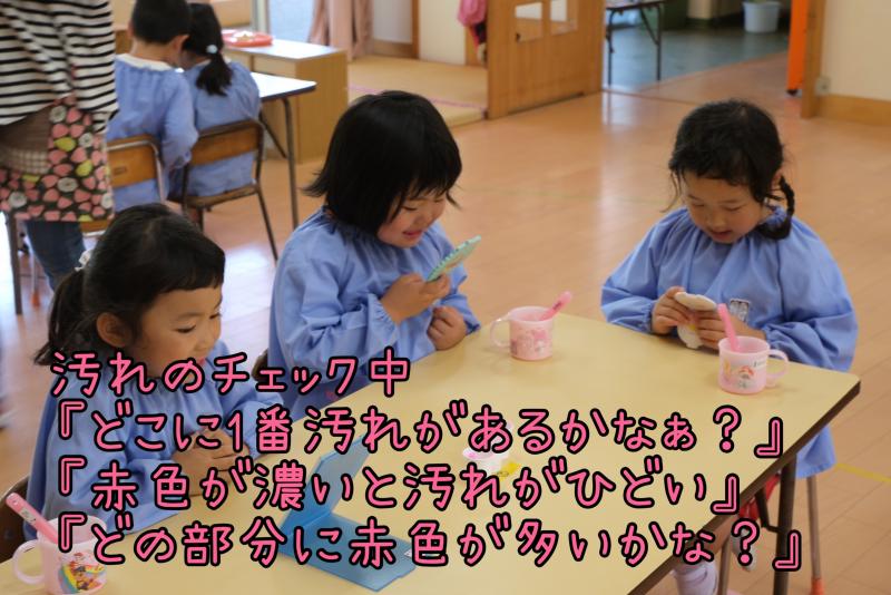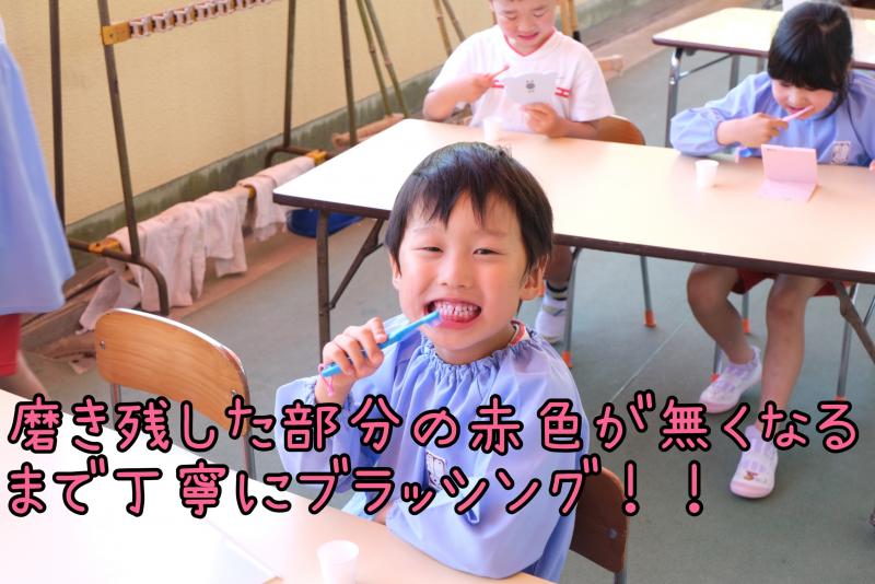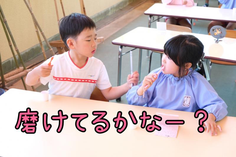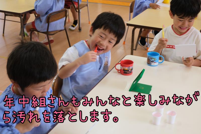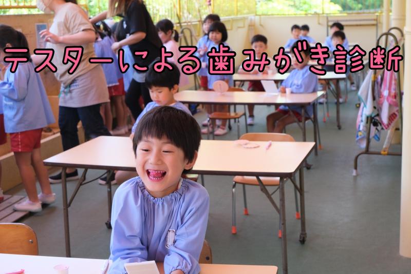 「虫歯予防デー」毎年歯みがき指導を行っています。まずは、ペープサートによる「ムシバイキン兄弟と秘密基地」のお話です。年中・年長組対象に「テスター」を使い歯みがき診断。みがき残した部分の赤色がなくなるまで丁寧にブラッシング。どうすれば白い歯に戻るか、お友達と一緒に試行錯誤いつもより長くきれいにしよう!と意識することでみがき残しや、歯みがきの大切さがわかりました。自分の歯で一生過ごせたらどんなに幸せでしょう。健康は口元から!!!丁寧な歯みがき習慣を心がけましょう。