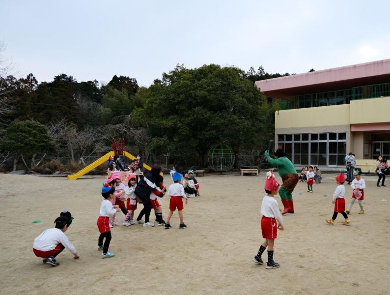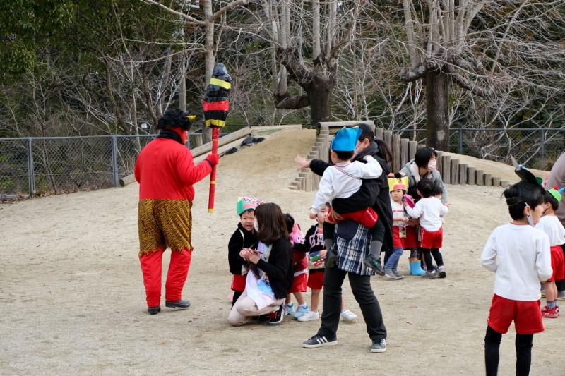 令和5年2月3日(金)節分の日です。朝から「今日は鬼来る?」と、ドキドキそわそわ・・・3人の鬼の登場です!!!自分たちの作った鬼のお面をかぶり「鬼は外!」「福は内!」元気いっぱい豆を投げる事が出来ました。鬼が帰ったあとは、福の神様の登場です☆「笑う門には福来る。」「この一年みんなが元気で笑顔がたくさんありますように。」と、福の神様が素敵な言葉をくれました♡